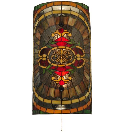 This stunning wall sconce reveals a magnificent symphony of rich art glass colors of Burgundy; Amber; Russet Green; Beige; and Clear Ripple Glass. A floral medallion is accented with fanciful scrolls and accents. Handcrafted utilizing Meyda's famous copperfoil construction process; this fixture is ideal for lighting up any room; especially corridors in residential and commercial settings. Custom colors; designs; styles and dimmable energy efficient lamping options are available.