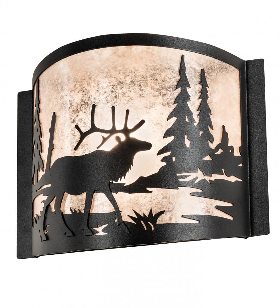 Rustic charm is captured beautifully. This majestic Elk meanders by a woodland lake while the morning sun rises in the background of this natural wildlife inspired wall sconce. Soft ambient light projects through a stunning Silver Mica shade which is complemented with a Textured Black finish. This curvaceous ADA Compliant wall fixture is Made to Order in our 180;000 square foot manufacturing facility in Yorkville; NY. Diffuser colors; metal finishes and fixture sizes can be customized. UL and cUL listed for dry and damp locations.