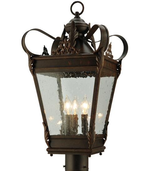 Acanthus leaves; decorative accents and hand forged Iron Scrollwork in a Gilded Tobacco Finish highlight this regal looking lantern. This stately post mount features a Clear Seeded Glass that reveals three complementary faux candle lights. Ideal for indoor and outdoor lighting applications. The Verona can be mounted directly on to posts or decorative columns. Custom crafted by highly skilled artisans in our 180;000 square foot manufacturing facility in Yorkville; NY. Custom sizes and finishes are available. Dimmable energy efficient lamping options offered. UL and cUL listed for dry; damp and wet locations.