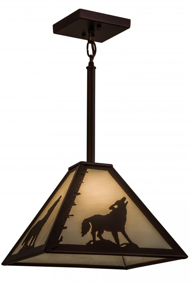 A lone sentinel wolf howls to others of his kind as he stands high on a mountaintop in this striking lighting design. Ambient glow projects through White art glass as the accents; frame and hardware are featured in a warm Mahogany Bronze finish. Handcrafted in the Meyda manufacturing facility; located at the foothills of the Adirondack Mountains; this pendant is available in custom designs; colors; sizes and dimmable energy efficient lamping.