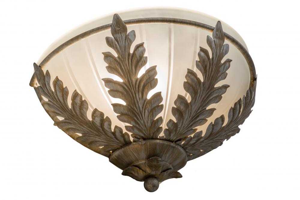 Capturing an elegant design; sculpted metal acanthus leaves adorn this classic wall sconce which is highlighted with stunning Clear Frosted Melon Glass. The finial; decorative accents and hardware are featured in an Antique Silver finish. Custom crafted in the USA; this fixture is available in custom sizes; styles; colors and dimmable energy efficient lamping options. The sconce is UL and cUL listed for damp and dry locations.