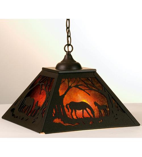 A Mare and Foal stroll through the woods on this nature inspired pendant. The rustic fixture is finished in Cafe Noir and has Amber mica panels. Handcrafted by highly skilled artisans in our 180;000 square foot manufacturing facility in Yorkville; New York. Custom colors; styles and sizes are available. Dimmable energy efficient lamping options. UL and cUL listed for dry; damp and wet locations.