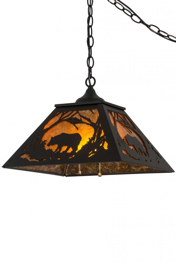 This nature inspired pendant depicts a majestic Bear meandering through entangled trees in an enchanting forest as the warm summer sun beckons in the background. Beautiful ambient light is emitted through stunning Amber Mica; which is enhanced by accents and frame featured in a Textured Black finish. The fixture is handcrafted by highly skilled artisans in our manufacturing facility at the foothills of the Adirondack Mountains in the USA. Custom designs; sizes; colors and dimmable energy efficient lamping options such as LED are available. This pendant is UL and cUL listed for dry and damp locations.