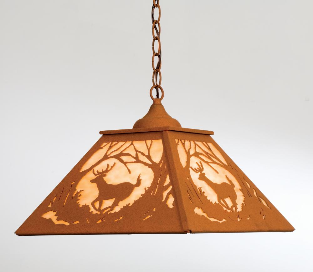 This nature inspired pendant depicts a majestic Deer meandering between two entangled trees in an enchanting forest as the warm summer sun beckons in the background. Soft ambient light is emitted through stunning Beige art glass; which is enhanced by accents and frame featured in an Earth finish. The fixture is handcrafted in the Meyda facility at the foothills of the Adirondack Mountains in the USA. Custom designs; sizes; colors and dimmable energy efficient lamping options are available. This pendant is UL and cUL listed.