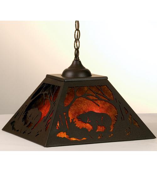 A Grizzly Bear strolls through the woods on this nature inspired pendant. The rustic fixture is finished in Cafe Noir and has Amber mica panels. Handcrafted by highly skilled artisans in our 180;000 square foot manufacturing facility in Yorkville; New York at the foothills of the Adirondack Mountains. Custom colors; styles and sizes are available. Dimmable energy efficient lamping options. UL and cUL listed for dry and damp locations.