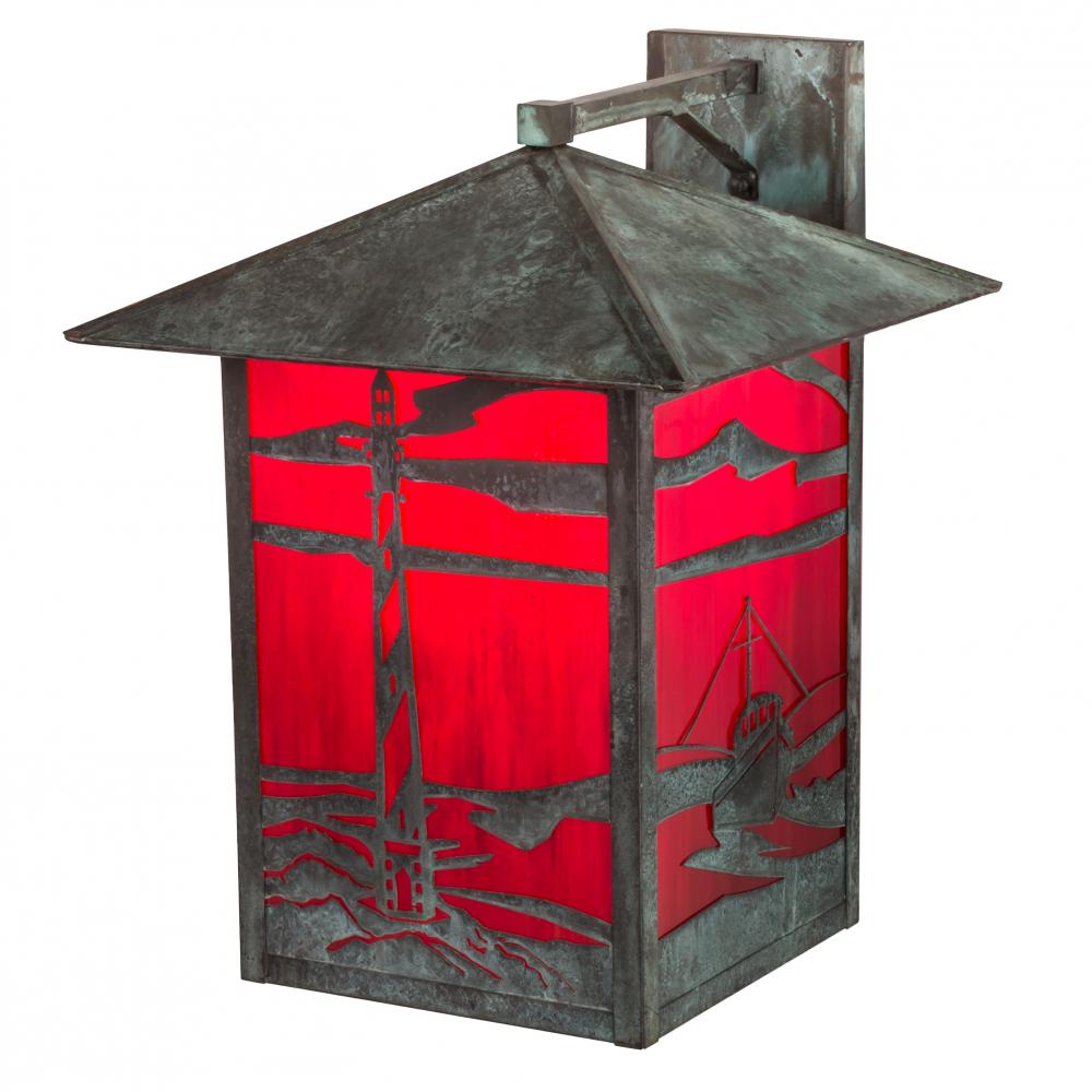 Help boaters navigate the waterways by adding lanterns to your boathouse; marina and other residential and commercial settings. This stunning indoor/outdoor lantern reveals a Verdigris finished nautical scene of a lighthouse and fishing boat on a striking Red Art Glass background. This wall fixture is Domestically Produced in the USA in our 180;000 sq ft manufacturing facility in Yorkville; NY. Customize shade colors; metal finishes and fixture sizes. UL and cUL listed for dry; damp and wet locations.