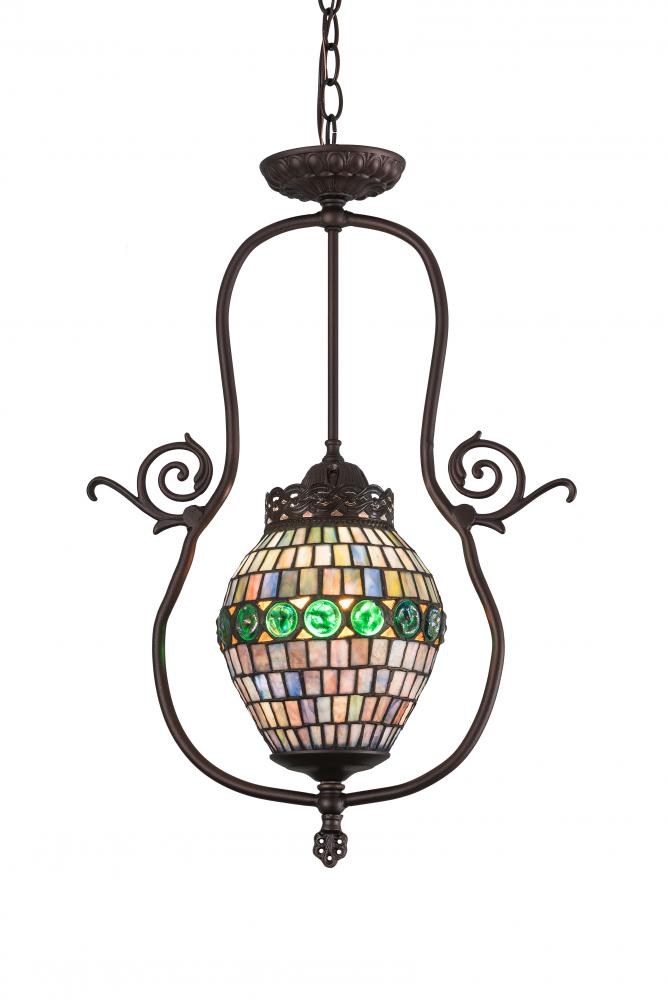 Bedazzling and luxurious define this exquisite pendant. Emerald colored Belted Turtleback jewels line this brilliant shade on a background of Earthy Blues; Greens and Amber art glass. The shade is created using the famous Meyda Tiffany copperfoil construction and complemented with a Mahogany Bronze finish. Overall height ranges from 26 to 61 inches as the chain can be easily adjusted in the field. The Belted Turtleback Pendant is included in our American designed; handcrafted Tiffany Reproduction Glass Lighting Collection. UL and cUL listed for dry and damp locations. No two art glass shades will be the same as their individuality can be as remarkably unique as their personality.
