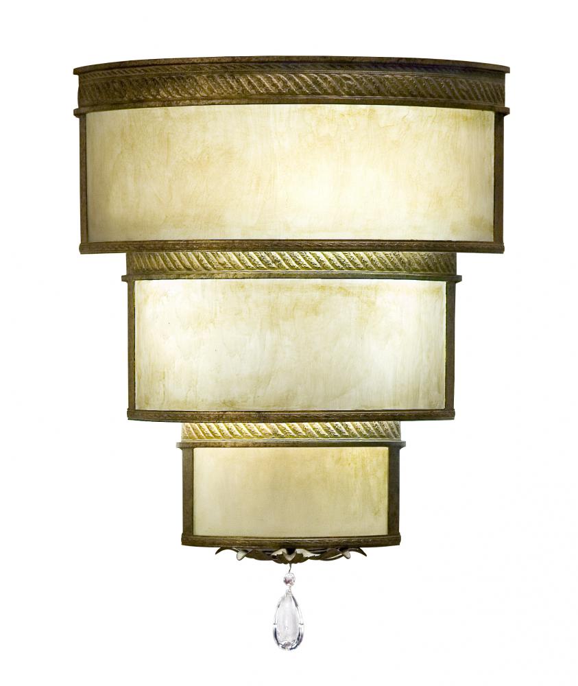 A luxurious 3-tiered wall sconce design reveals an elegant; distinguished architectural look which is accented with rope-like trim. Clean sophistication astounds with round surfaces to enhance the Botticino Idalight diffuser that is enhanced with Corinth finished accents and hardware. The fixture is perfect illumination for corridors and other rooms in residential and commercial areas. The fixture illuminates with 3 Customer-supplied Fluorescent PL 26-watt lamps. Handcrafted by highly skilled artisans in the USA. Options include energy efficient lamping options; as well as custom sizes; styles and colors. This 18-inch wide sconce; which includes a Crystal Pendalog accent on the bottom; is UL and cUL listed for damp and dry locations.