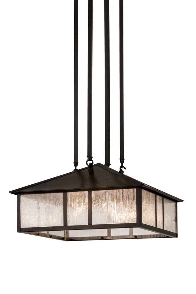 Designed with an efficiency of a straight line design inspired by the Arts and Crafts Movement; a clean geometric Mission style is accentuated on Clear Seeded art glass simulating gentle raindrops drizzling softly on a windowpane. The diffuser is enhanced with decorative accents; hardware and a frame finished in Craftsman Brown. The pendant is custom crafted by Meyda artisans in Upstate New York in the USA. Dimmable energy efficient lamping options such as LED; as well as custom sizes; styles and colors; are available. This fixture is UL and cUL listed for damp and dry locations.