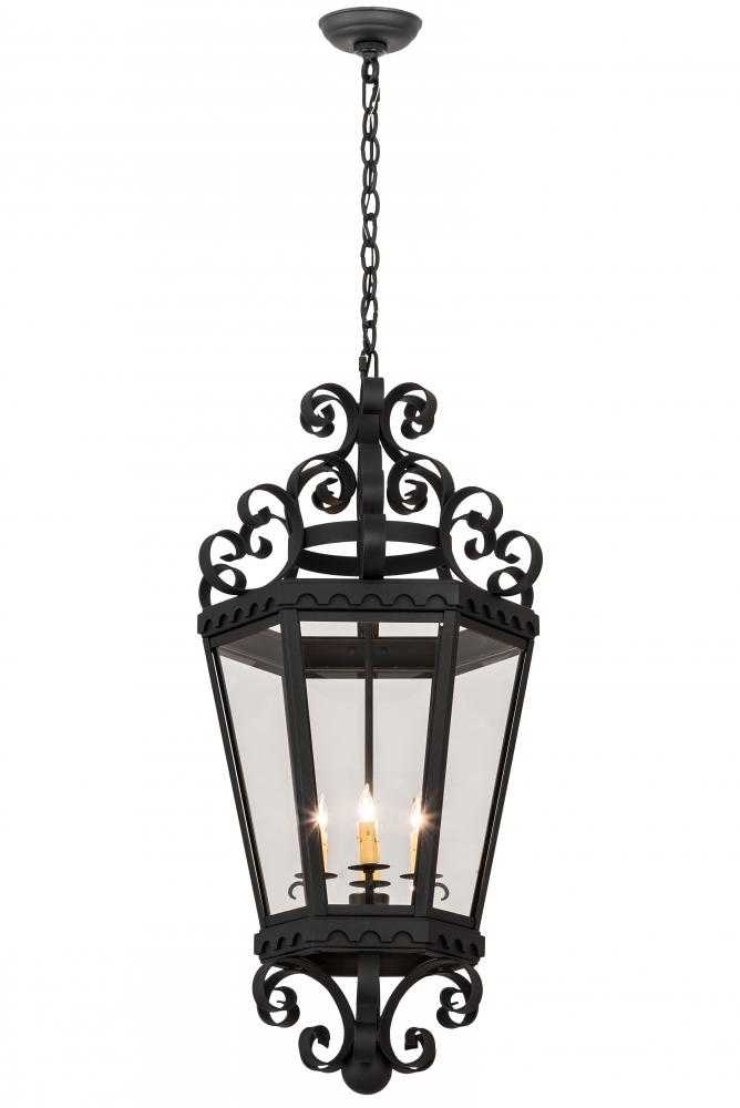 The sophisticated Cadenza lantern is designed with elaborate scroll details and brilliant elegance. This exquisite pendant is custom crafted of Hand-forged iron with a hand-applied Black Textured finish and complemented with 6 panels of Crystal Idalight. Designed with high-style appeal; the fixture is used for beautiful ambient lighting in corridors; entryways; on porches; and in other rooms in a variety of residential and commercial spaces. Custom designs; sizes and finishes are available; as well as dimmable energy efficient lamping options such as LED. The 18-inch wide pendant is UL and cUL listed for dry and damp locations.
