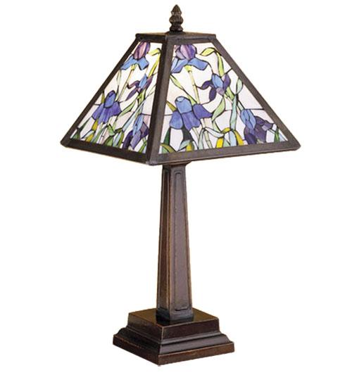 This charming accent lamp has a Brass bound shade that holds beautiful stained glass mosaic panels that featuring Purple Irises on a White background. This shade is offered on a linear base; hand finished in Mahogany Bronze.