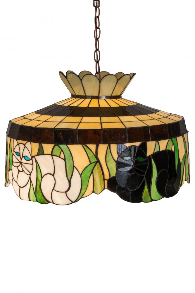 Purr-fect connoisseurs of comfort; these beautiful Cats sit among the Green Leaves on a Beige Art Glass background. Cats are featured in Gray with White; Orange; Black; and White. The shade is crowned with a grid like stained glass pattern and Bark Brown Granite Glass trim. The pendant is enhanced with a Mahogany Bronze finish. The handcrafted shade is created with the famous Meyda Tiffany copperfoil construction. The Cat Pendant is featured in our American designed; handcrafted Tiffany Lighting Collection. UL and cUL listed for dry and damp locations.