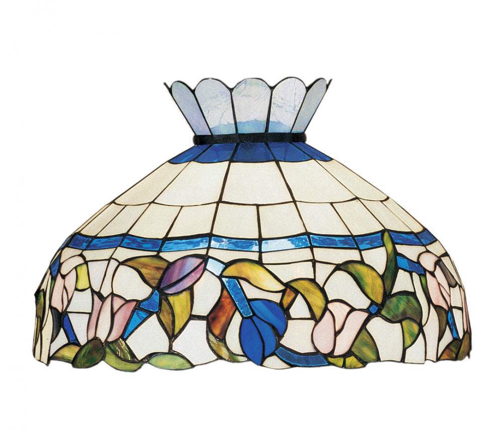 Colorful blooming roses in shades of Pink and Mauve circle a White trellis of glass; accented by ribbon; vines and buds in Blue with Earthy leaves to complete the look of this stunning crowned shade. This beautiful stained glass shade is created using the famous Meyda Tiffany copperfoil construction process. The colorful shade accommodates hardware to create stunning ceiling fixtures and table and floor lamps.