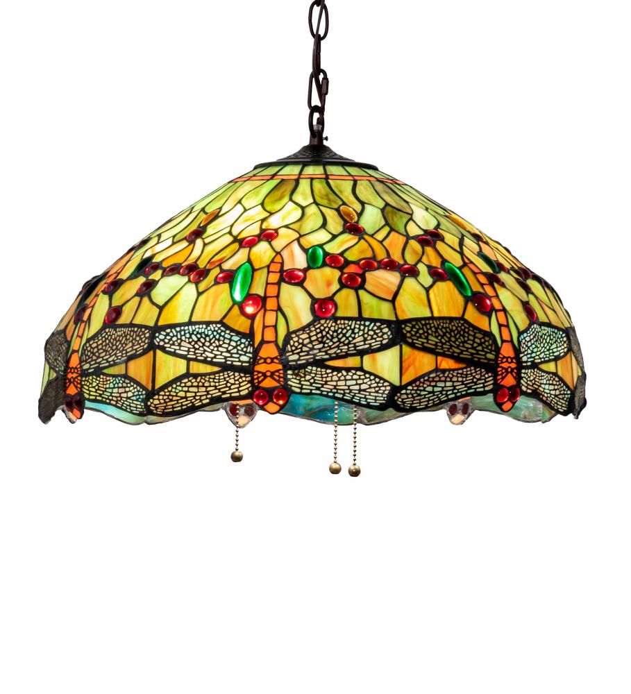 Inspired by one of Tiffany Studio's classic Dragonfly lighting masterpiece. Orange dragonflies with glowing Red jeweled eyes and filigree topped Multi-colored wings dive over a Green and Orange background. The stunning shade is accented with Red; Green and Amber glass jewels. The art glass shade is created using the famous Meyda Tiffany copperfoil construction. This Tiffany Reproduction pendant is enhanced with a warm hand applied Mahogany Bronze finish. Overall height ranges from 15 to 50 inches as the chain length can be easily adjusted in the field to accommodate your specific lighting needs. UL and cUL listed for dry and damp locations.