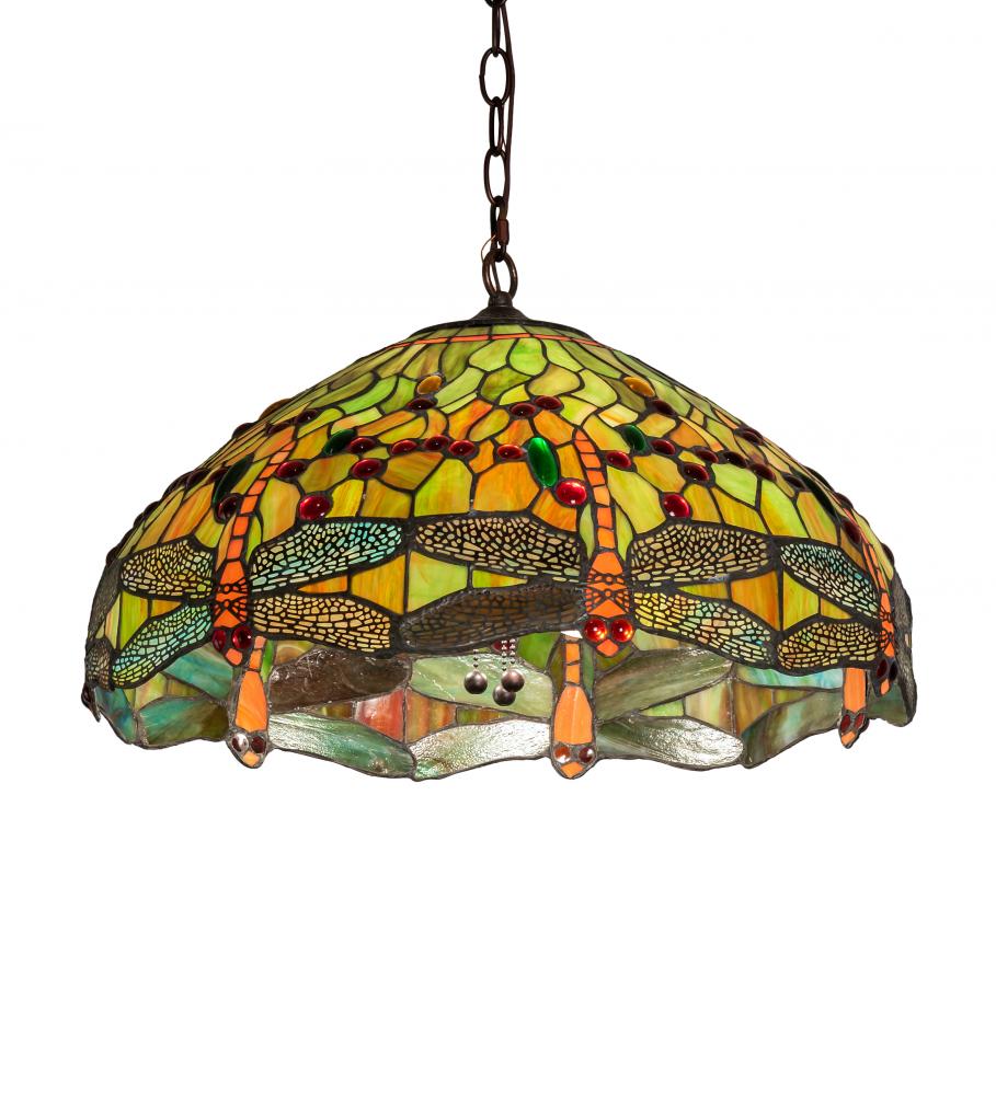 Inspired by one of Tiffany Studio's classic Dragonfly lighting masterpiece. Orange dragonflies with glowing Red jeweled eyes and filigree topped Multi-colored wings dive over a Green and Orange background. The stunning shade is accented with Red; Green and Amber glass jewels. The art glass shade is created using the famous Meyda Tiffany copperfoil construction. This Tiffany Reproduction pendant is enhanced with a warm hand applied Mahogany Bronze finish. Overall height ranges from 15 to 50 inches as the chain length can be easily adjusted in the field to accommodate your specific lighting needs. UL and cUL listed for dry and damp locations.