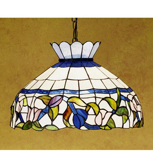 The unique color variations of stained art glass are the perfect complement to popular nature themes of copperfoil shades. A virtual flower garden of glass; in Pink; Periwinkle; and Mauve; is featured on a White grid patterned shade which is offered on Mahogany Bronze finished hardware.