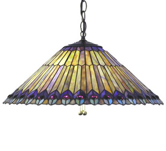 As distinctive as beautiful Peacock fanning feathers in the wild; no two shades will ever be the same as their individuality can be as remarkably unique as their personality. This artistic creation utilizes swirling opalescent art glass background combinations including Beige; Yellow Pinks; Golden Greens; Ivories; Bluish Whites; Turquoise Blues; Olive and Spring Greens. The eye of the plumage design reveals Purples; Pastel Blues; Teals; Cobalt and Ivories; accented with Blue and Purple colored jewels. Individual pieces of glass are hand cut and wrapped using Meyda Tiffany's famous copperfoil construction. Each shade is a unique work of art with color variations based on natural ingredients inherent in the glass.