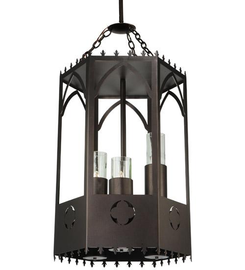 Miniature Gothic speartips accent the top and bottom trims of this pendant while six rounded cross are featured on Mahagony Bronze finished panels above three candlelights. Perfect for a home; church; hotel; restaurant; retail or commercial space. Custom colors; sizes and styles available. Energy efficient lamping options offered. Handcrafted in the Meyda manufacturing facilities by highly skilled artisans in Upstate New York.