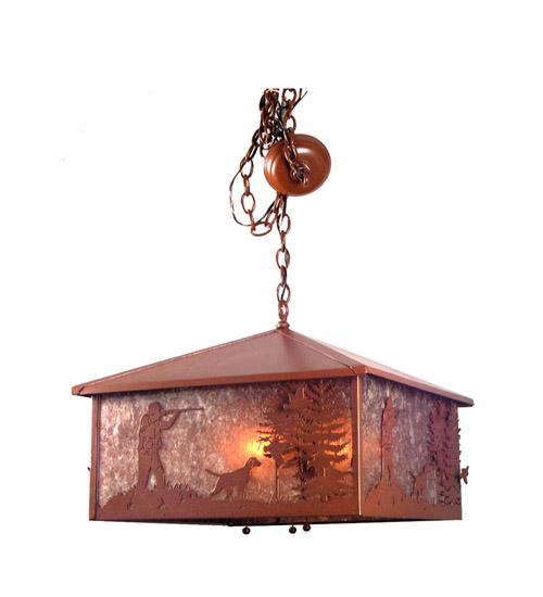 A hunter and dog companion flush a quail from its wooded retreat on this rustic lantern pendant handcrafted in the USA by Meyda artisans. This nature inspired fixture is finished in Rust and has Silver mica panels.