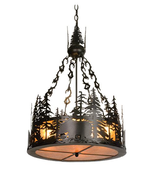 A nature inspired Black Bear in a Pine forest tops this inverted pendant shade with Amber mica panels. The fixture is finished in Textured Black and is handcrafted in the USA by Meyda artisans.