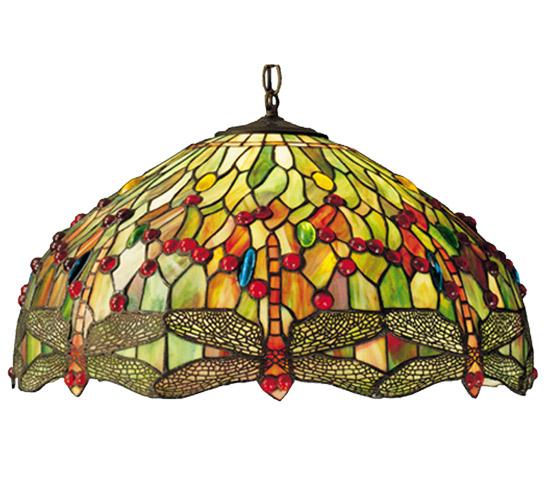 This version of Tiffany Studio's most beloved stained glass dragonfly design; is modeled after the original hanging head dragonfly. Diving dragonflies with glowing Scarlet jeweled eyes and delicate metal filigree wings circle over hand cut and copper foiled pieces of Amber; Pond Green and Scarlet art glass and glistening jewels of Amber; Emerald and Scarlet that represent sunset reflections on rippling water. The pendant hardware is finished in a warm hand applied Mahogany Bronze.