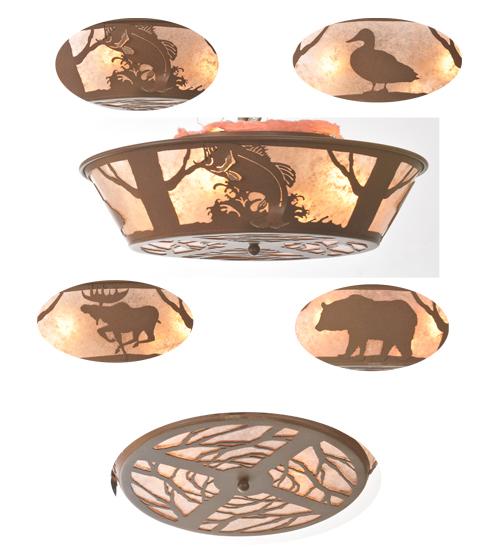 The call of the wild comes to light with exquisite designs of a Mallard Duck; Trout; Bull Moose and Black Bear in this stunning wildlife inspired fixture. Beautiful ambient light shines through a Silver Mica diffuser while the shade is enhanced with accents and hardware featured in a Cafe Noir finish. Custom crafted by Meyda expert artisans in its manufacturing facility at the foothills of New York?s glorious Adirondack Mountains; this fixture is available in custom sizes; finishes and designs and dimmable energy efficient lamping options such as LED. The flushmount is UL and cUL listed for damp and dry locations.