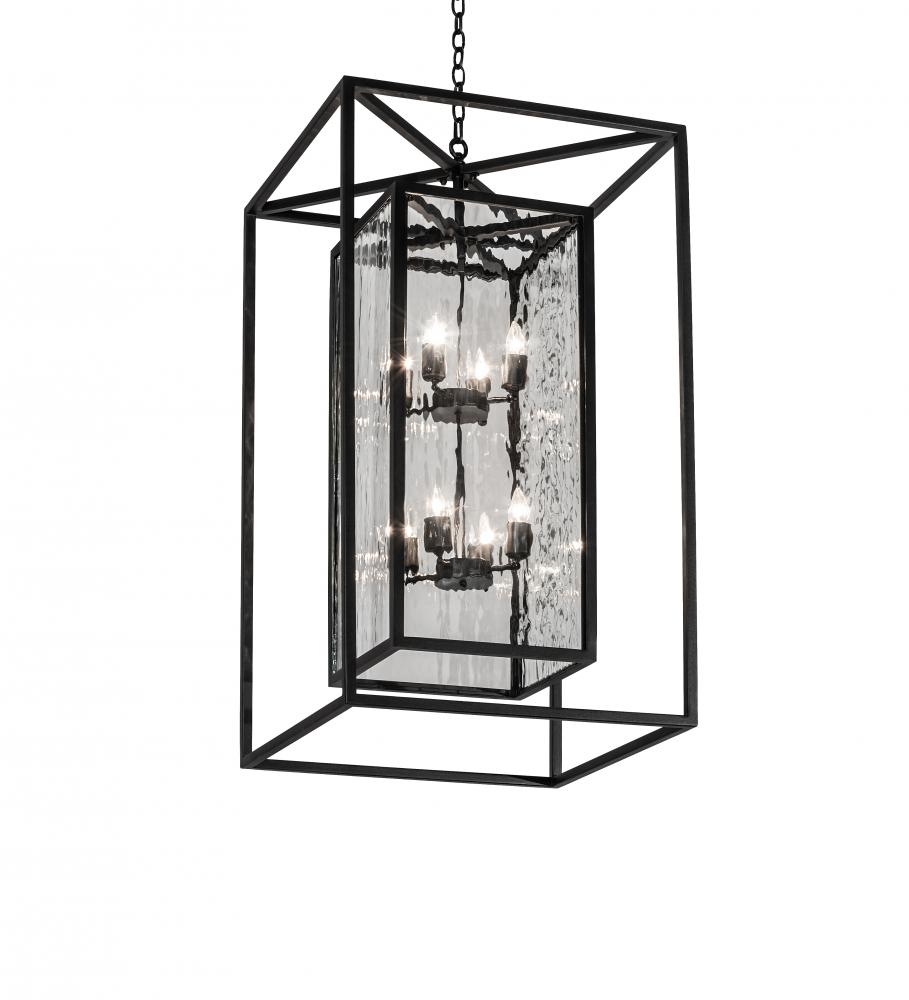 This modern; architecturally styled fixture is designed with a pizazz that is unique; fresh and stylish. Give your decor an extra edge with this innovative pendant featuring a Clear Waterglass Lens within a larger solid box frame. Suspended inside the cage are 8 Complementary faux candlelights. The elaborate frame and hardware are featured in a Solar Black finish. Overall height ranges from 47 to 166 inches as the chain can be easily adjusted in the field. Made to Order in our 180;000 square foot manufacturing facility in Yorkville; New York. Diffuser colors; metal finishes and fixture sizes can be customized to your needs. UL and cUL listed for dry and damp locations.