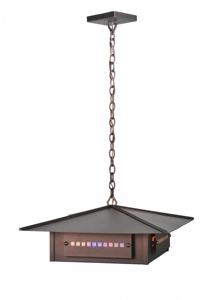 Inspired by naturally weathered stones on the path to a cozy cottage in the woods; Beige Iridescent glass tiles are hand-set on raised side panels of this Arts &Crafts styled pendant. Behind the art glass insets is a layer of Amber Mica to provide a unique decorative ambiance. The raised panels and and shallow peaked roof; hand-finished in Cinnamon Coffee Metallic; create the signature look of American Bungalow. The fixture; included in the Moss Creek family; is handcrafted by Meyda artisans in the Yorkville; New York manufacturing facilities