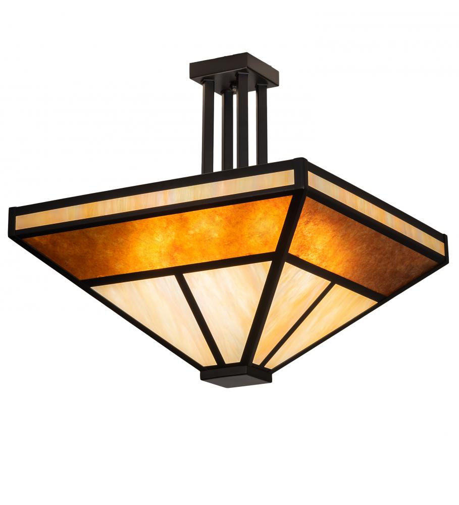 The material is Steel; Glass and Mica. The finish is Flat Black. The diffuser is Amber Mica and Beige Glass.