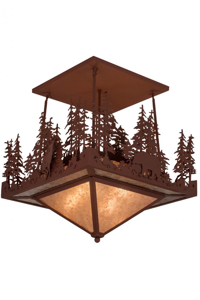 The call of the wild comes to light with a Deer and Grizzly Bear roaming among a vast stand of Pine Trees around a woodland lake as the brilliant afternoon sun sets in the background. Beautiful ambient light shines through Silver Mica which is enhanced with a frame; hardware and decorative accents featured in a Rust finish. The fixture is custom crafted by highly skilled artisans in its manufacturing facility at the foothills of New York's glorious Adirondack Mountains. This ceiling fixture is available in custom designs; styles; sizes and dimmable energy efficient lamping options such as LED. This fixture is UL and cUL listed for damp and dry locations.