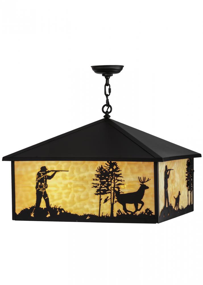 Striking images of a sportsman hunting deer and quail in the woods while the morning sun rises in the background. Warm ambient light projects through Beige art glass complemented with a frame and hardware featured in a Black Textured finish. Perfect for dens; mancaves; outdoor retailers and sports shops. Handcrafted by Meyda artisans in our manufacturing facility at the foothills of the Adirondack Mountains. Custom designs; sizes and styles available. Energy efficient lamping options.