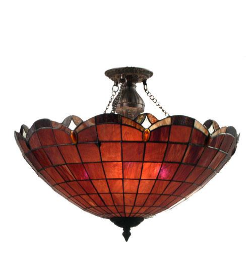 A Raspberry Garned stained glass shade trimmed in swooping scallops of Amethyst hues accented by sparkling Amber jewels and Clear granite glass. This semi flush features carved leaves in a Verdi Washed Ebony finish. The early 20th Century inspired motif; re-explored by the Meyda Tiffany design team; integrates Art Nouveau with Victorian.