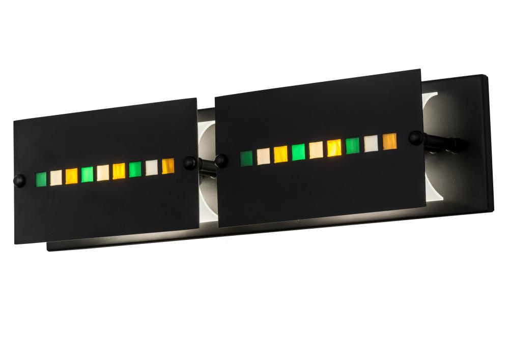 Inspired by naturally brilliant colored stones on the path to a cozy cottage in the woods; fresh and colorful glass tiles in hues of Green; Beige; Honey and White Frosted are hand-cut and hand-set on raised side panels of this Arts &Crafts styled; two-light wall fixture. Behind the vivid art glass insets is a layer of Clear Frosted glass to provide a unique decorative ambiance. The raised panels and hardware are hand-finished in Solar Black to create a bold signature look. Ideal as a vanity light in a bath or a sconce in a corridor; this fixture is handcrafted by Meyda artisans at the foothills of the beautiful Adirondack Mountains. Custom sizes; styles; colors and dimmable energy efficient lamping options are available. This fixture is UL and cUL listed for damp and dry locations.