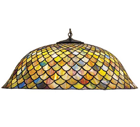 A Louis Comfort Tiffany studio classic fishscale pattern reproduced in variegated glass of Honey dripped Emerald; Sapphire; and Garnet. This handsome stained glass shade is used with Mahogany Bronze hand finished hardware. A versatile pendant to complement any color or style.