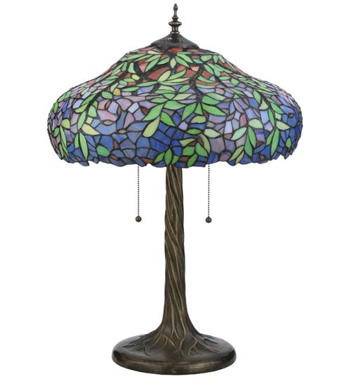Cascading blossoms in hues of Plum and Blue glass with Spring Green leaves were favored subjects of the L. C. Tiffany Studio. This beautiful Laburnum stained glass shade with undulating border; is paired with a classic twisted tree base in an antique patina finish.