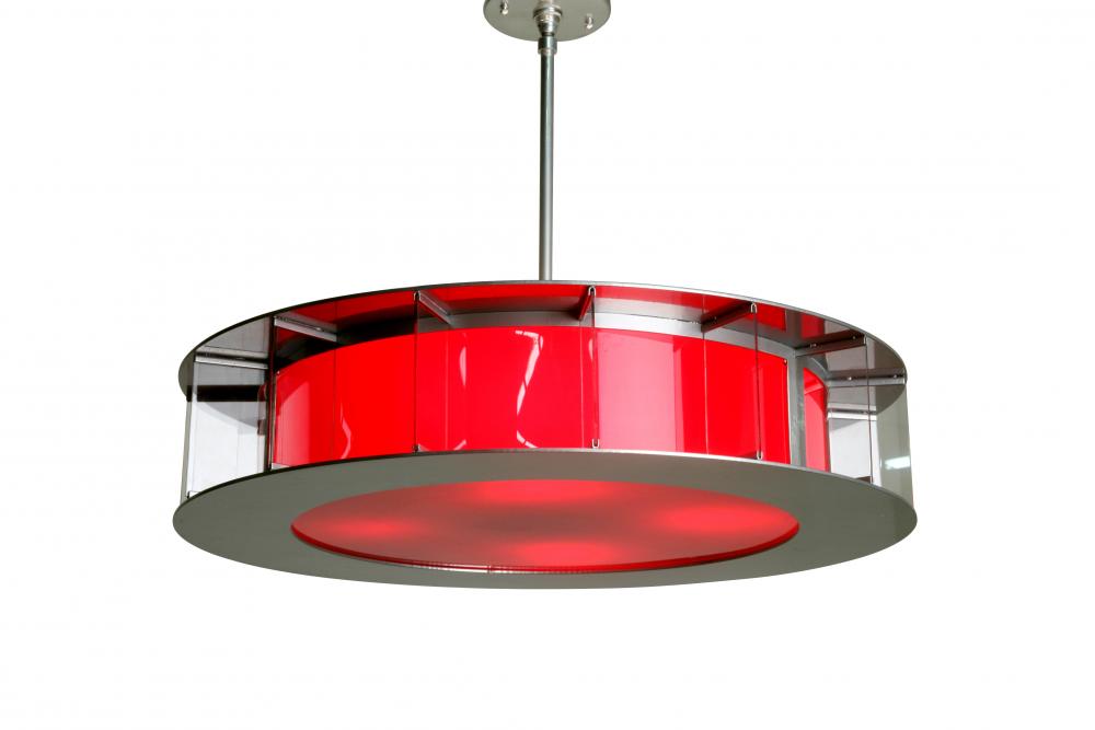 A stunning Red Idalight ring is featured within this contemporary pendant and complemented with a frame and hardware finished in a Nickel powdercoat. This fixture was created by the hands of highly skilled artisans at our manufacturing facility in Upstate New York in the USA. Custom sizes; styles and colors are available; as well as dimmable; energy efficient lamping options. The 26-inch wide fixture is UL and cUL listed for damp and dry locations.