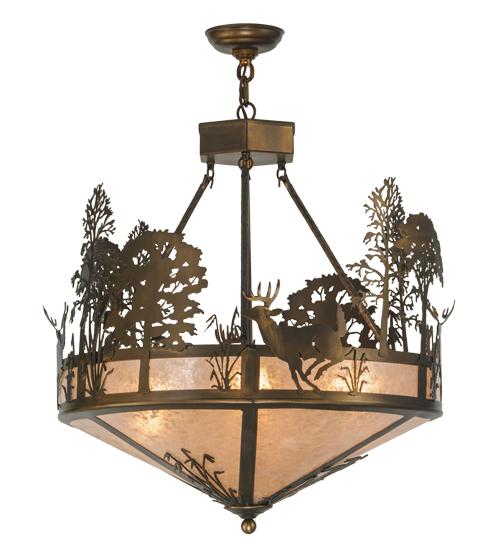Rustic charm is captured beautifully with this striking pendant design of a young buck leaping through the trees in the woods.Warm ambient lighting is created by a stunning Silver Mica light diffuser enhanced by the decorative accents; frame and matching hardware finished in Antique Copper. Handcrafted in the Meyda manufacturing facility; located at the foothills of the Adirondack Mountains.Additional wildlife and custom designs available; as well as energy efficient lamping options.