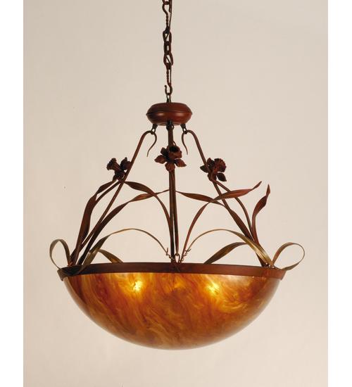 Luxurious brilliance and elegance come to light with this shade which accented with steel Daffodil flowers and leaves. The Amber Quartz Idalight shade is complemented with hardware and decorative accents featured in a hand-painted Rust finish. Made in the USA; this pendant is available in custom sizes; designs; and colors; and with dimmable energy efficient lamping options. The fixture is UL and cUL listed for dry and damp locations.