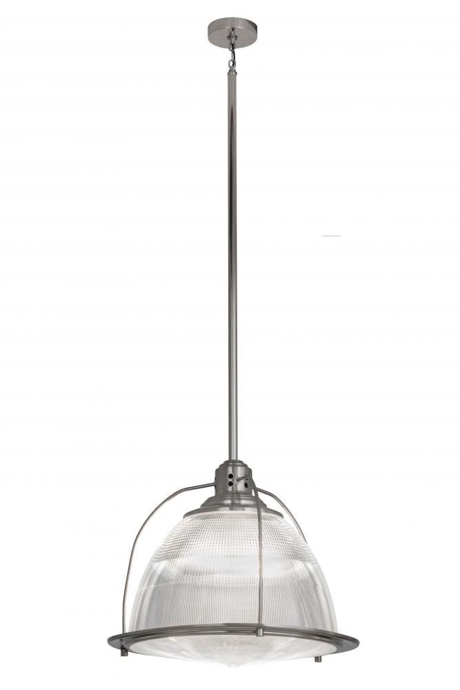 Designed to create a classic industrial look coupled with intriguing effects of diffused ambient light; this pendant features a dome shaped lens handcrafted of Prismatic Crystal Idalight; with a matching bottom diffuser. The architectural styled trim; matching frame and hardware are featured in a Brushed Nickel finish. Custom crafted in the USA; this fixture is available in custom designs; styles and sizes; as well as dimmable energy efficient lamping options. The pendant is UL and cUL listed for damp and dry locations.