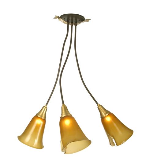 The 3-Arm Wilmington Ceiling Pendant features three elegant Amber colored; mouth-blown art glass shades. Each delicate shade has a glossy exterior with matte finished interior; and features a unique decorative split with folded accent. The shades are extended from the ceiling with sturdy metal rods hand-finished in a handsome Timeless Bronze with Brass highlights. The fixture is custom crafted in Yorkville; New York by the hands of highly skilled Meyda Tiffany artisans.