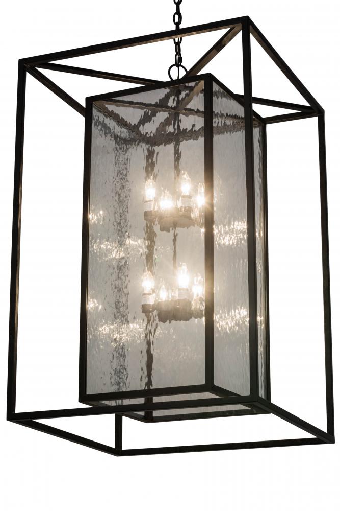 A sophisticated architecturally styled fixture is designed with a pizazz that is unique; fresh and stylish. Give your decor an extra edge with this breathtaking fixture; which is highlighted with a solid steel structure that surrounds a Clear Water Glass shaped diffuser. Beautiful ambient illumination is delivered by 8 faux candlelights. The hardware and frame are featured in a Solar Black finish. Handmade in our 180;000 square foot manufacturing facility in Yorkville; New York. Available in custom sizes; styles and finishes; as well as dimmable energy efficient lamping options. UL and CUL listed for dry and wet locations.