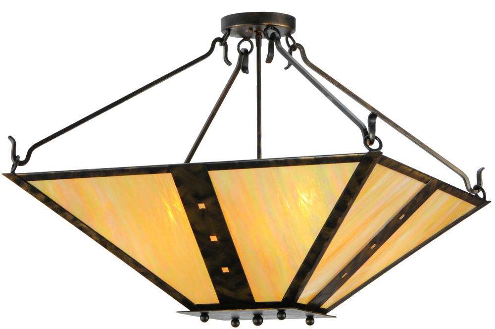 Inspired by the Arts & Crafts design movement; Zandra is designed with an inverted Mission styled Beige Iridescent art glass diffuser that is complemented with a frame and hardware featured in an Antique Black finish. The shade is accented with miniature square geometric designs in the central bands and five decorative studs on the finial. This fixture is custom crafted at the Meyda manufacturing facility in Upstate New York; in the USA. Custom colors; sizes and styles are available; as well as dimmable energy-efficient lamping options. The fixture is UL and cUL listed.