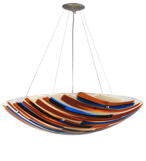 Make an exciting design statement in a home; store; restaurant; club or commercial setting with our Oceano pendant. Striking fused glass defines an extraordinary pendant comprising strips of Amber; Beige and Ice Blue art glass. It features Brushed Nickel hardware. Hand crafted by Meyda artisans in our Yorkville; New York manufacturing facilities. Custom colors; styles and sizes available. Energy efficient lamping options. UL listed for damp locations.
