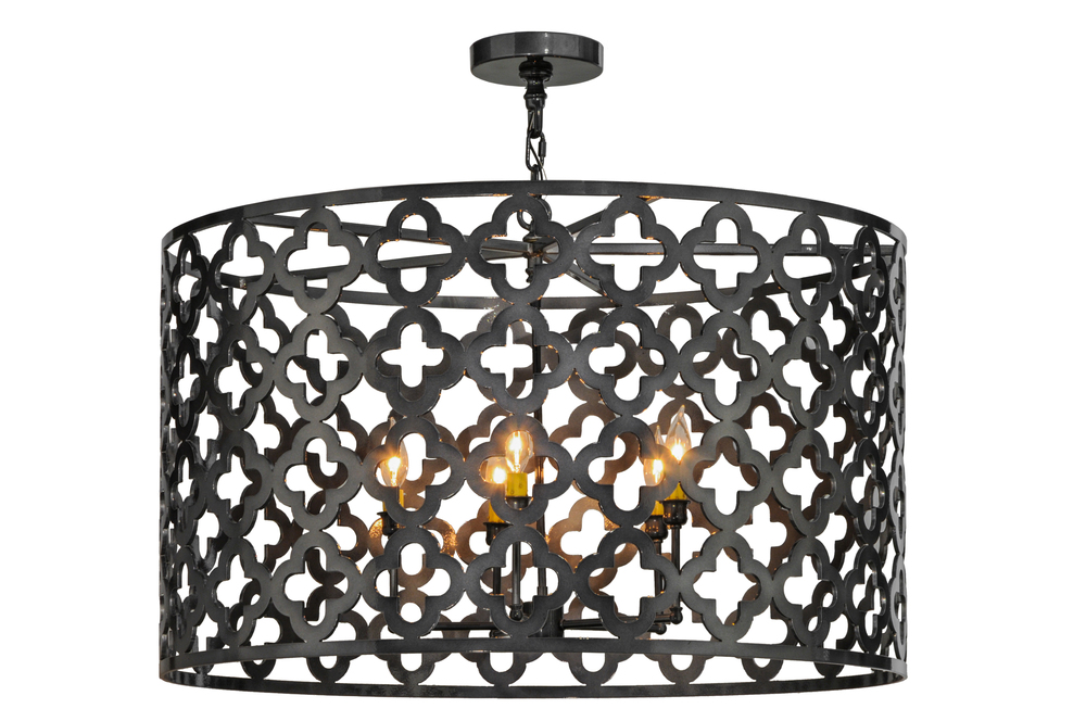 You are in luck. This charming pendant features dramatic Four Leaf Clover silhouettes around the perimeter. The shade reveals a 5-light faux candelabra for beautiful ambient lighting. The hardware and frame are featured in a Black Chrome finish. The overall height of this pendant ranges from 27 to 74 inches as the chain length can be easily adjusted in the field to accommodate your specific lighting application needs. Custom crafted by highly skilled artisans in our 180;000 square foot manufacturing facility in Yorkville; New York. Special sizes; finishes and diffuser colors available. UL and cUL listed for dry and damp locations.