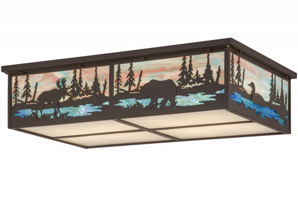 Invite the Great Outdoors inside your home or business with this stunning lighting design; which features the majestic Elk and Bear meandering around a Blue; Green and White woodland lake with a beautiful sky background blending Pink; Plum; Blue and White art glass. The art glass shade; created using Meyda's famous copperfoil construction; is complemented with decorative accents and hardware in a Timeless Bronze finish. Crafted by skilled artisans at the foothills of the Adirondack Mountains in Upstate New York. Custom sizes; styles; colors and dimmable energy efficient lamping options are available. UL and cUL listed.