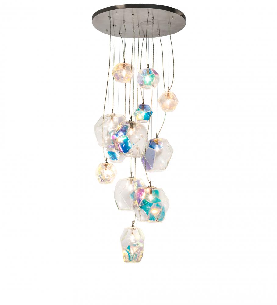 Drama and beauty appear to fall exquisitely from the sky in this stunning cascading pendant. An array of Organic styled Clear Glass Elements with Iridescent Accents dazzle and mesmerize while delivering a dozen points of light. The hardware enhances the fixture with a Nickel finish and the height of each decorative element ranges from 72 to 174 inches as the black cords and aircraft cables can be adjusted in our factory to meet your lighting needs. The Kalos Eidos Chandelier is featured in our American made; American designed Contemporary Lighting Collection. Manufactured in Yorkville; NY. UL and cUL listed for dry and damp locations.