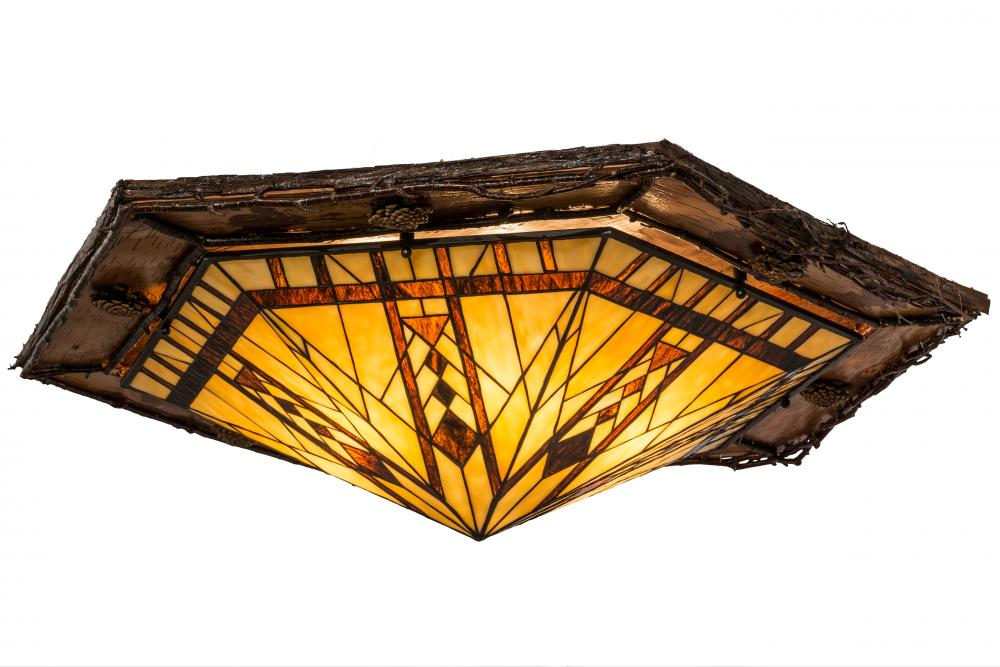 Enchanting southwestern styling and an intriguing Native American design reveal the magic and mystery of tribal symbols in stunning art glass and matching hardware. The hexagonal lighting fixture shade features a Sand Beige and Bark Brown granite glass shade which is created with the famous Meyda Tiffany copper foil construction. Shade embraces a wooden medallion frame with pinecones that is flush-mounted to the ceiling. Handcrafted by highly skilled artisans in our 180;000 square foot manufacturing facility at the foothills of the Adirondack Mountains. Custom styles; colors; and sizes available; as well as dimmable energy efficient lamping options. UL and cUL listed for dry and damp locations.