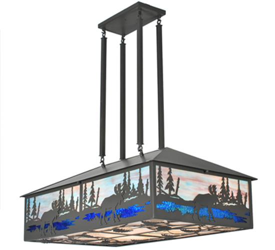 The majestic moose set on a mountain lake against the sunset sky. The bottom diffuser is made of white stained glass against a silhouette of pinecones and branches. The overall height is 39 but we can customize this pendant to any height requested. Glass colors and metal finish can also be customized. Glass is shipped seperately; some assembly required. "