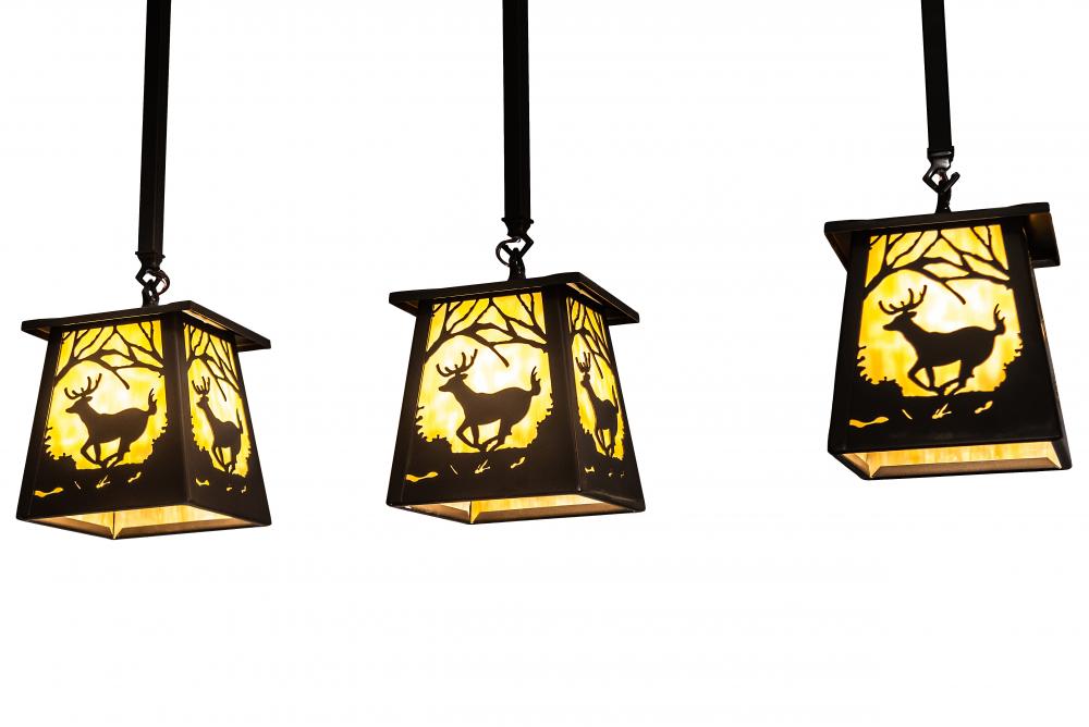 This pendant is designed with three shades featuring a Graceful Deer prancing through the woods in the beautiful afternoon sun. This nature inspired oblong pendant features Beige Art Glass Shades and is enhanced with a Bronze finish. Ideal for illuminating kitchen islands and tables; counters; bars and billiard tables. Made to Order in our 180;000 square foot manufacturing facility in Yorkville; New York; located at the foothills of the Adirondack Mountains. Additional wildlife and custom designs available; as well as custom shade colors; metal finishes and pendant sizes. UL and cUL listed for damp and dry locations.