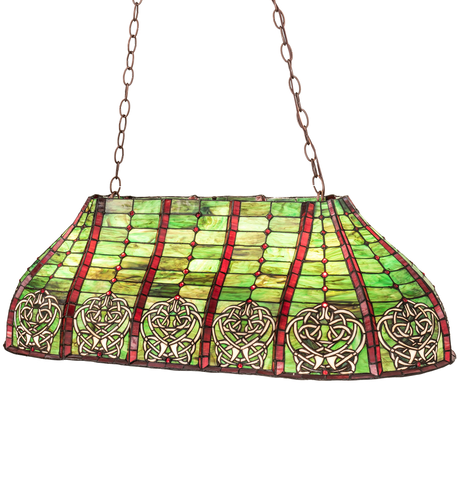 Inspired by Celtic Vines and Floral artwork. The dramatic Celtic Knot Lantern is a stunning piece of craftsmanship. The Celtic medallion features Beige interlaced knotwork complemented with Burgundy bands and jewels on an elegant Moss Green Art Glass background. The shade is created using the famous Meyda Tiffany copperfoil construction and with a Mahogany Bronze finish. Perfect for illuminating kitchen islands; billiard and dining tables; counters and bars. UL and cUL listed for dry and damp locations. Each shade is a unique work of art with color variations based on natural ingredients inherent in the glass. Contact us if color matching is critical when ordering multiple items.